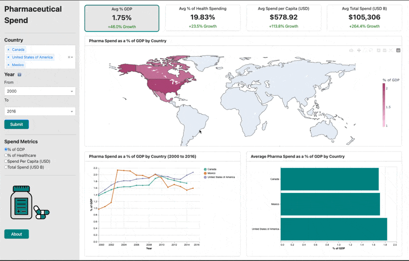 This project is based on Kaggle Pharmaceutical Drug Spending by countries data set, which originated from Organisation for Economic Co-operation and Development (OECD) collected data. With the data capped at 2016, this dashboard architechture can be easily integrated into a new data set.
